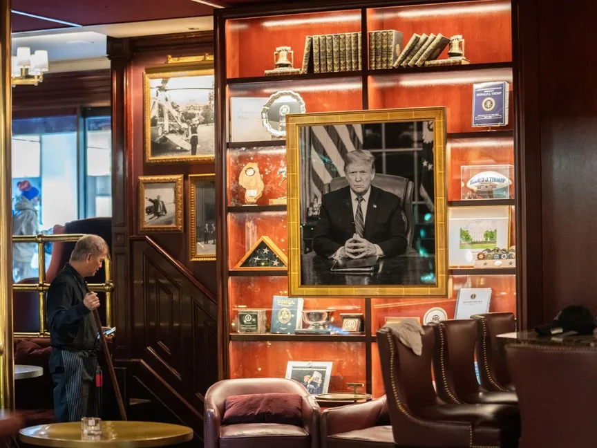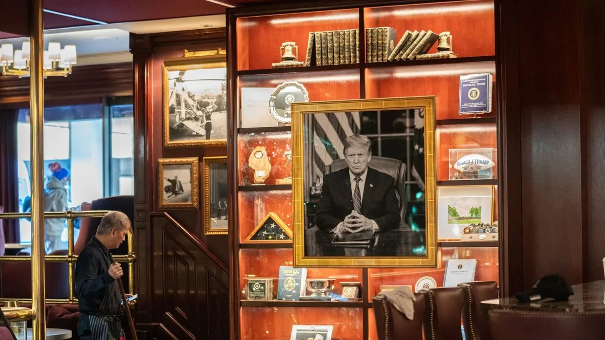 صورة للرئيس الأميركي السابق دونالد ترمب داخل برج ترمب في نيويورك، الولايات المتحدة في 16 فبراير 2024. قبيل صدور حكم في محاكمته بقضية الاحتيال المدني  في ولاية نيويورك - Bloomberg