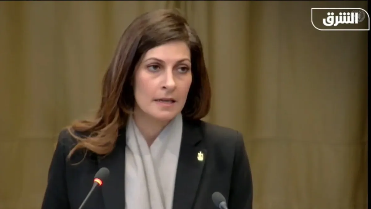 لقطة شاشة للمستشارة القانونية بمكتب وزير الخارجية المصري، ياسمين موسى، أثناء إلقاء مرافعة مصر أمام محكمة العدل الدولية في لاهاي، هولندا. 21 فبراير 2024 - الشرق