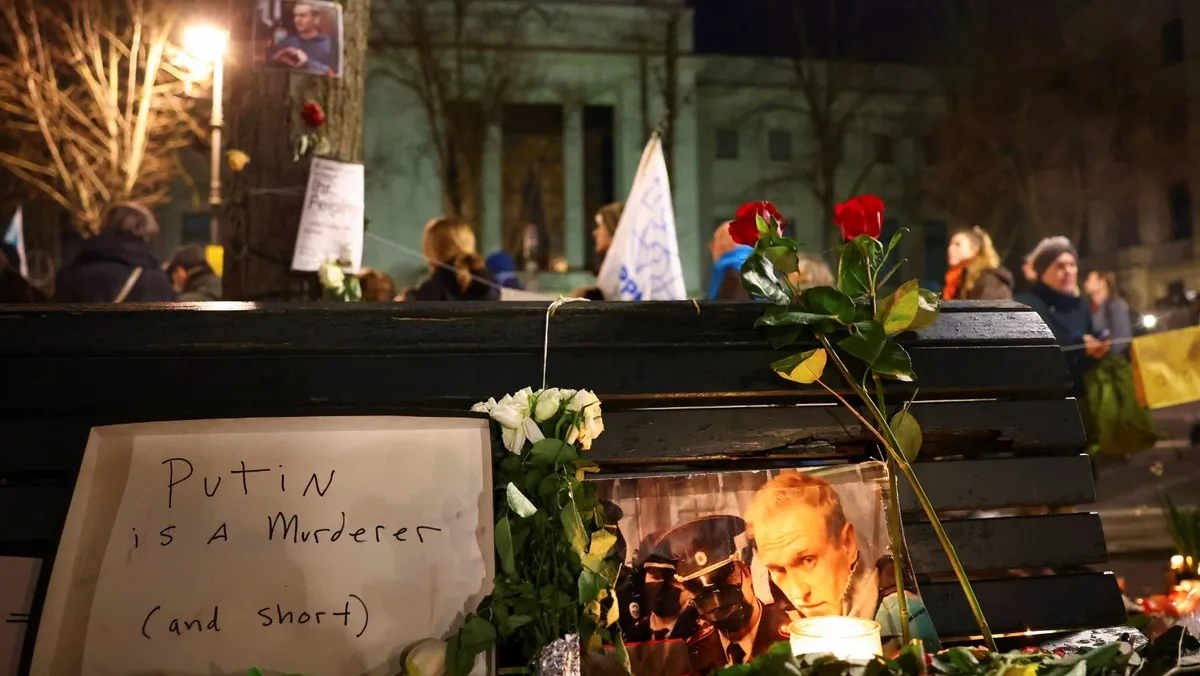 زهور وشموع بجوار صورة زعيم المعارضة الروسية الراحل أليكسي نافالني في أمام السفارة الروسية في برلين، ألمانيا. 23 فبراير 2024 - REUTERS