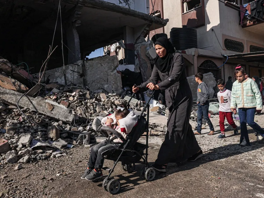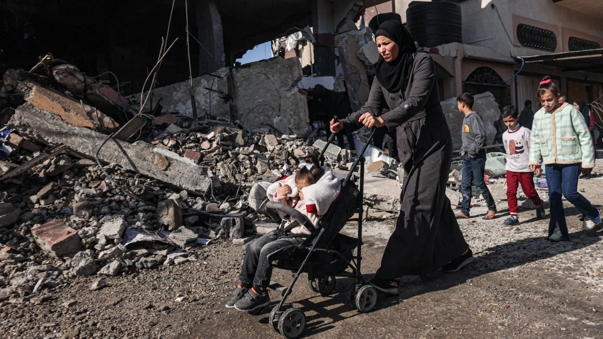 فلسطينيون يسيرون بجوار أنقاض مباني دمرتها غارات إسرائيلية في رفح، جنوب قطاع غزة. 24 فبراير 2024 - AFP