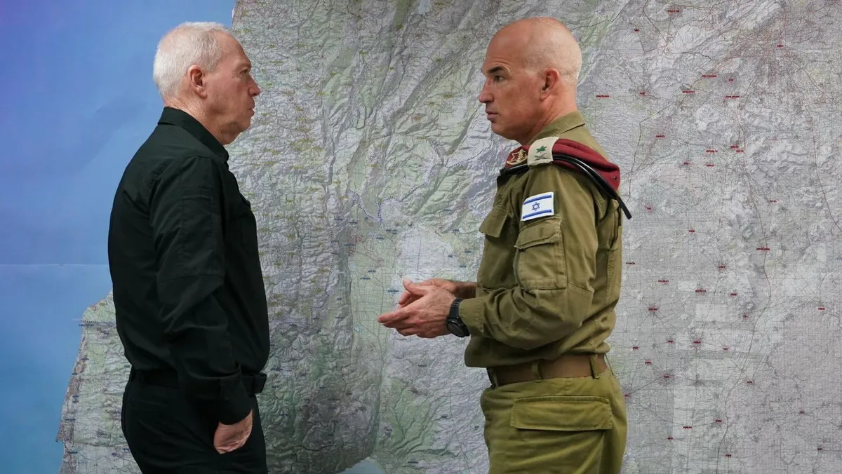 وزير الدفاع الإسرائيلي يوآف جالانت (يسار) يتحدث مع قائد القيادة الشمالية للجيش في صفد. 25 فبراير 2024 - twitter/yoavgallant
