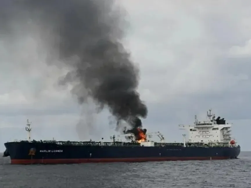 تصاعد دخان من السفينة التجارية مارلين لواندا بعد إصابتها بصاروخ حوثي مضاد للسفن في خليج عدن. 27 يناير 2024 - Reuters