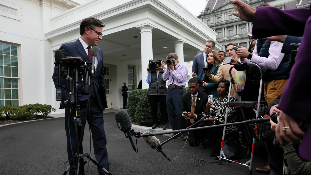 رئيس مجلس النواب الأميركي مايك جونسون يدلي بتصريحات لوسائل الإعلام في البيت الأبيض بعد اجتماعه مع الرئيس جو بايدن وعدد من قادة الكونجرس لبحث تفادي الإغلاق الحكومي. 27 فبراير 2024 - REUTERS
