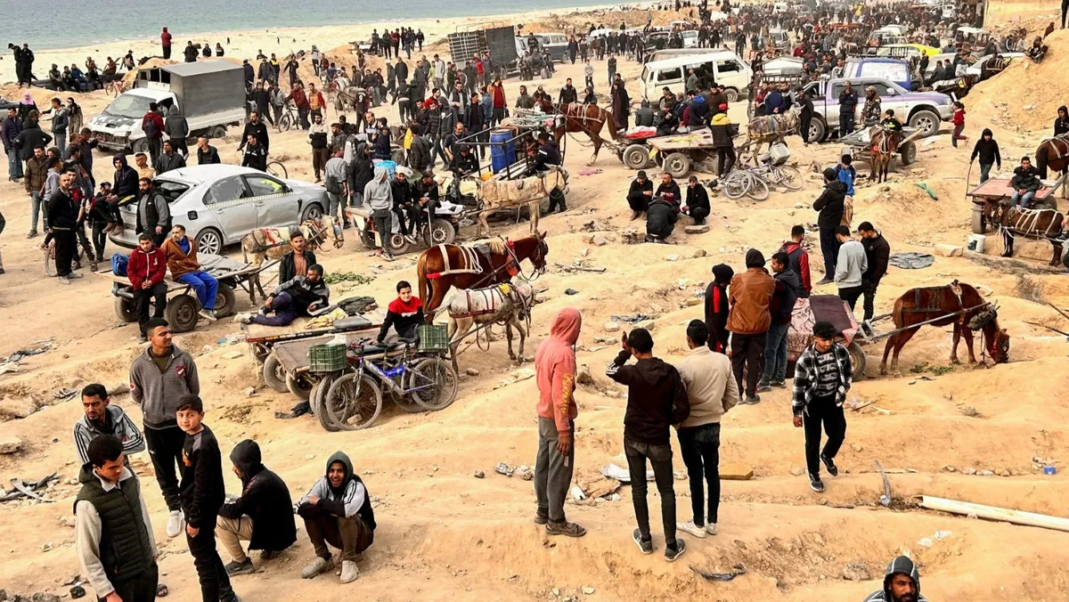 فلسطينيون بانتظار وصول شاحنات المساعدات إلى مدينة غزة في فلسطين. 29 فبراير 2024 - Reuters