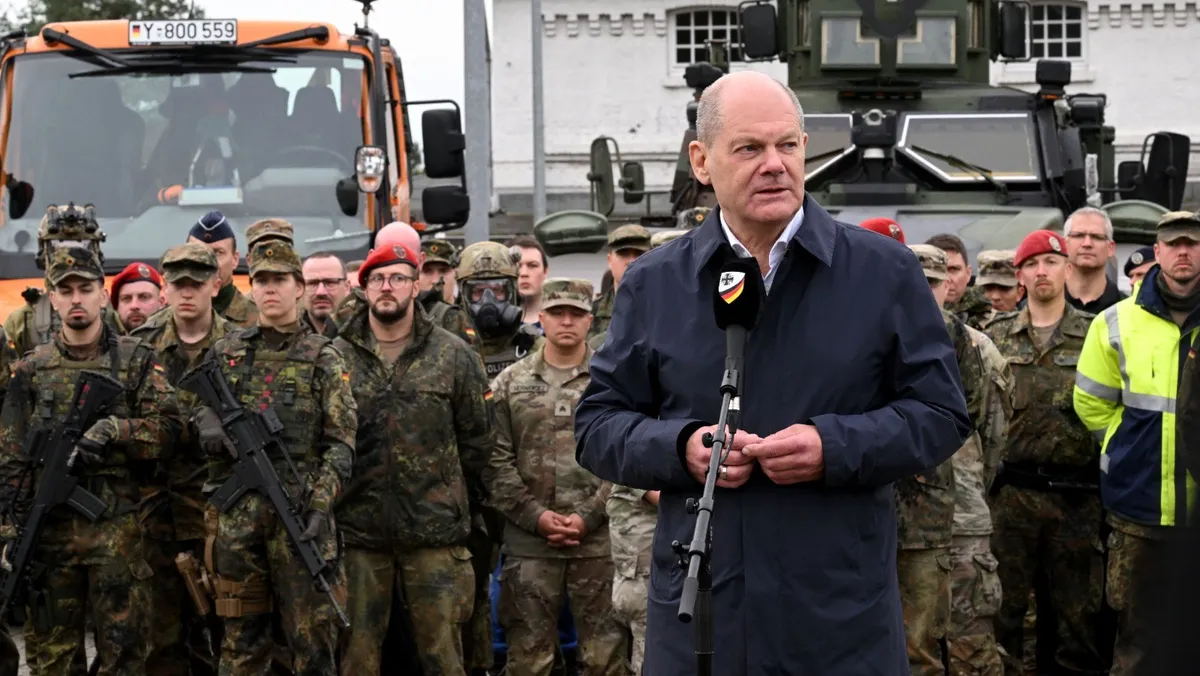 المستشار الألماني أولاف شولتز يقف بين جنود القوات المسلحة الألمانية، ويلقي بياناً في نهاية زيارته للجزء العسكري من مطار كولونيا-فان غربي ألمانيا، 23 أكتوبر 2023 - AFP