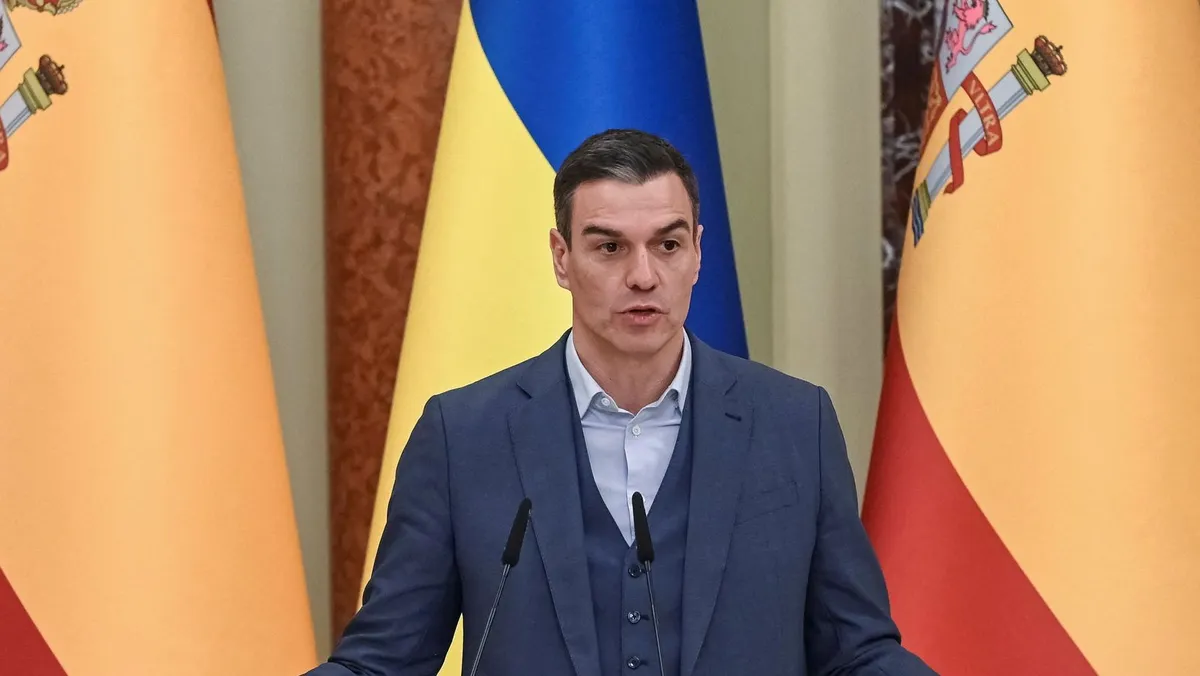 رئيس الوزراء الإسباني بيدرو سانشيز خلال مؤتمر صحافي في كييف. 23 فبراير 2023 - REUTERS