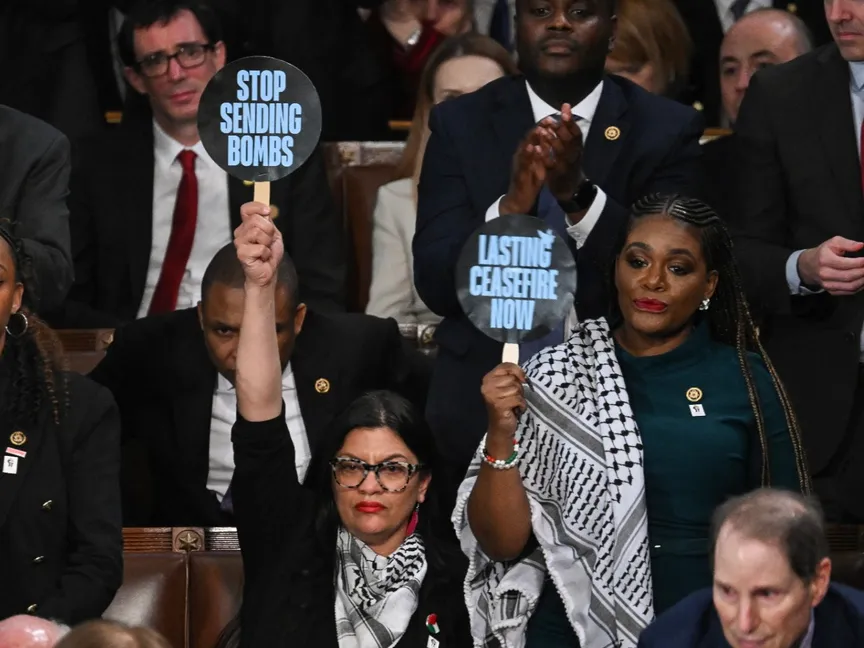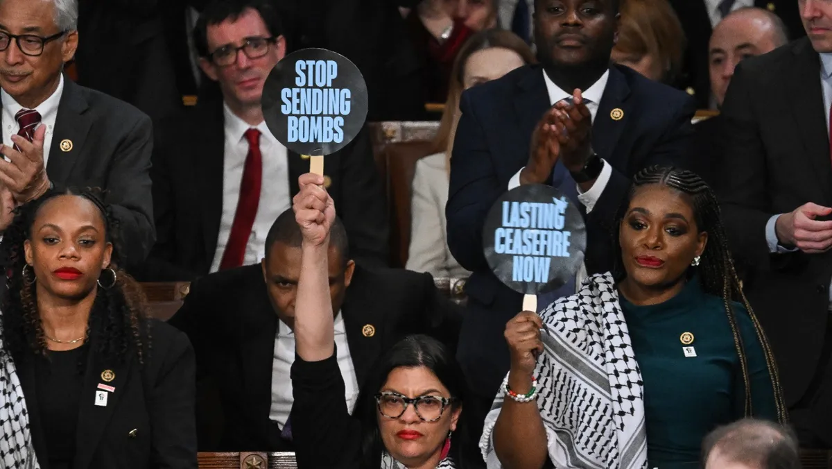 بينما رفعت النائبة الديمقراطية إلهان عمر لافتة تطالب بـ"وقف إرسال القنابل إلى إسرائيل"، بينما رفعت زميلتها الديمقراطية آيانا بريسلي لافتة أخرى تطالب بـ"وقف فوري لإطلاق النار في غزة".
