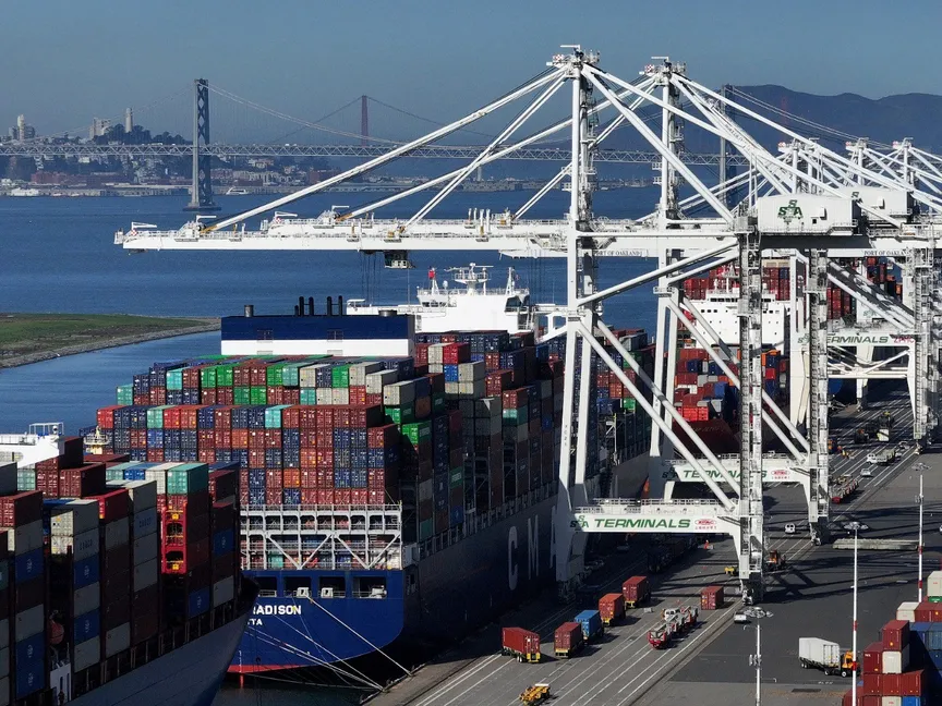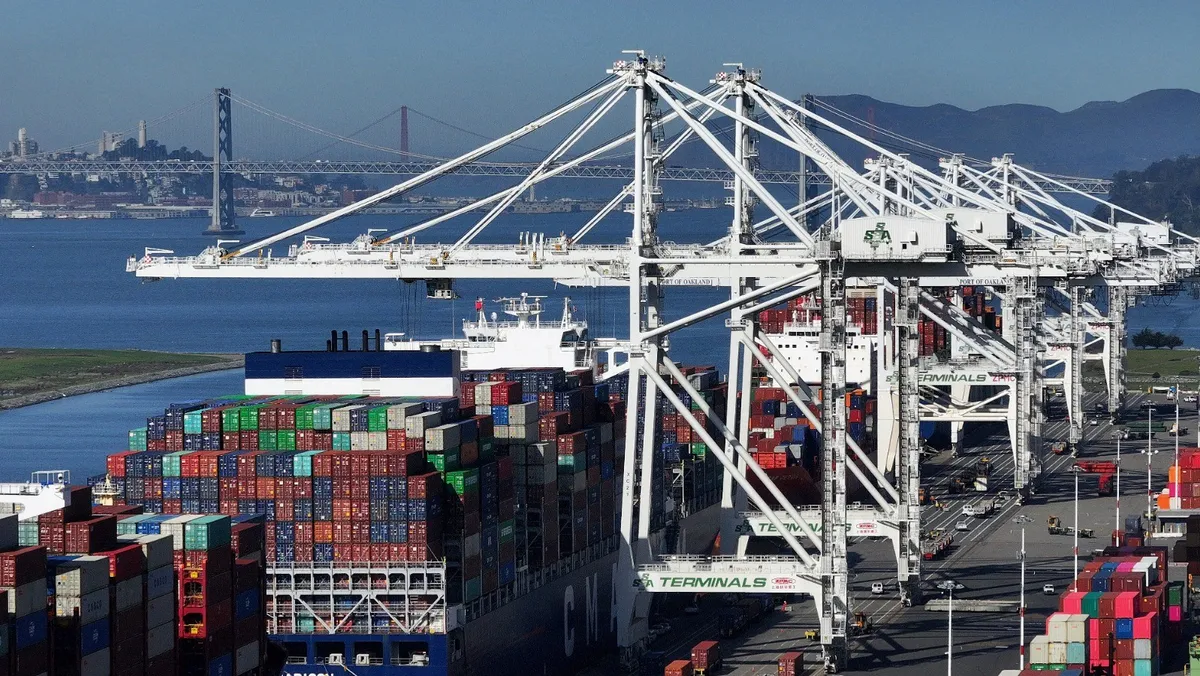 رافعات عملاقة من تصنيع شركة ZPMC الصينية تعمل في ميناء أوكلاند الأميركي. 8 مارس 2024 - AFP