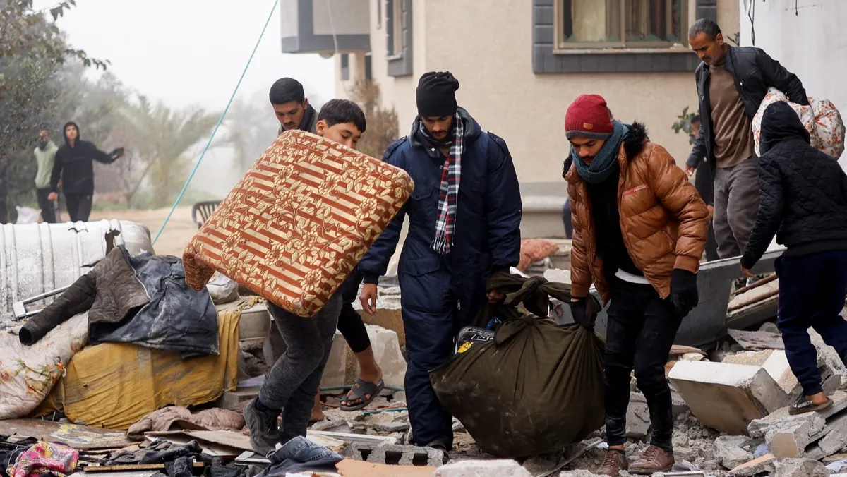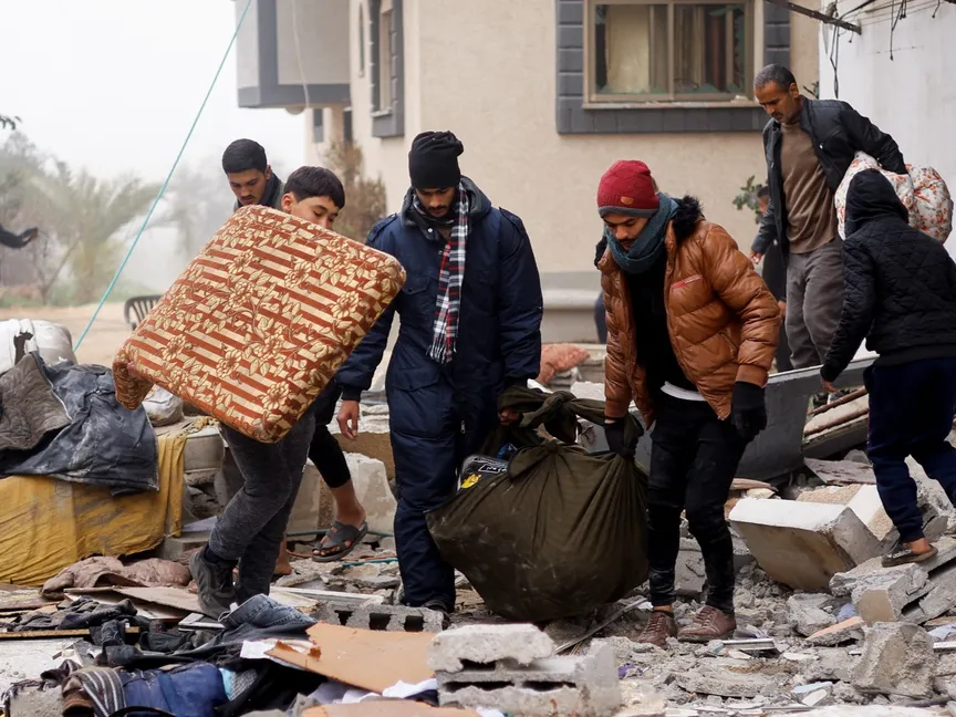 فلسطينيون يحملون ممتلكاتهم في موقع غارة إسرائيلية على منزل في رفح جنوب قطاع غزة. 9 فبراير 2024 - REUTERS
