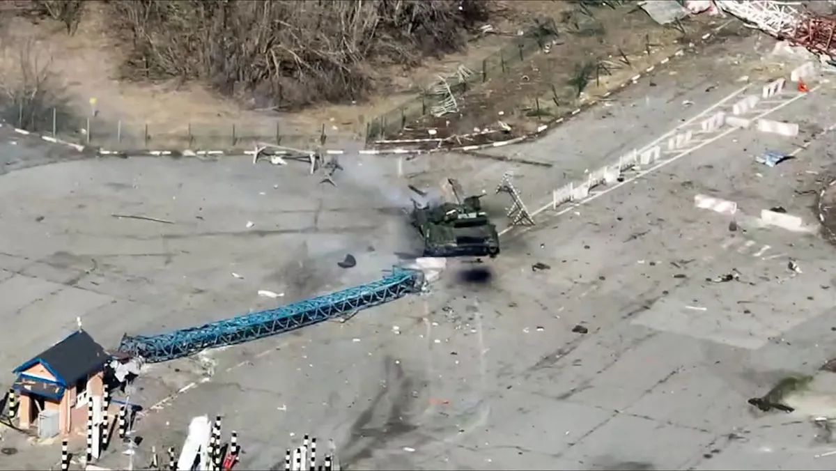 صورة مأخوذة من مقطع فيديو وزعته وزارة الدفاع الروسية يظهر حسب ما قالت مركبة عسكرية أوكرانية في الحدود بين روسيا وأوكرانيا بمنطقة بيلجورود - AFP