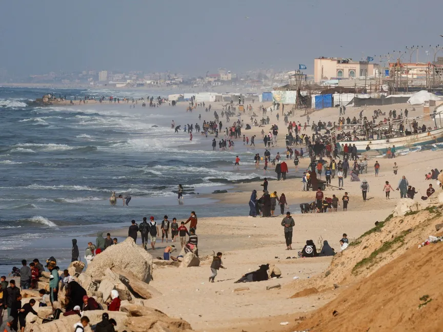 فلسطينيون يحتشدون على الشاطئ أملا في الحصول على مساعدات تسقطها طائرات على غزة. 27 فبراير 2024 - رويترز