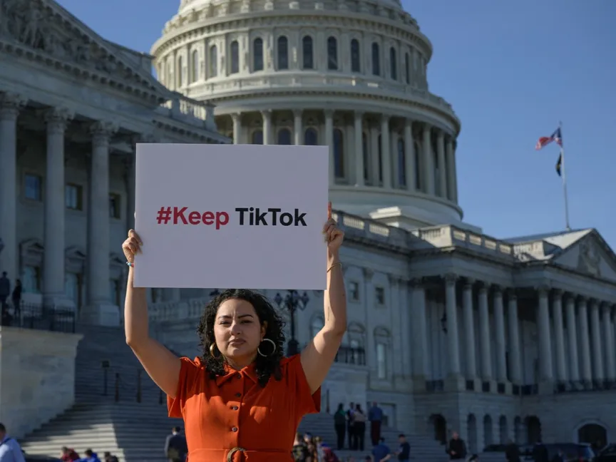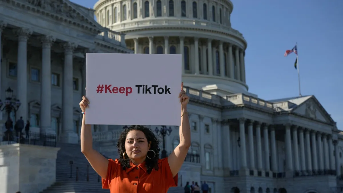 متظاهرة خارج مبنى الكابيتول الأميركي تعبر عن معارضتها لقانون "حماية الأميركيين من التطبيقات الأجنبية الخاضعة للرقابة" قبل قرار مرتقب لحظر "تيك توك" في الولايات المتحدة. 12 مارس 2024 - Reuters