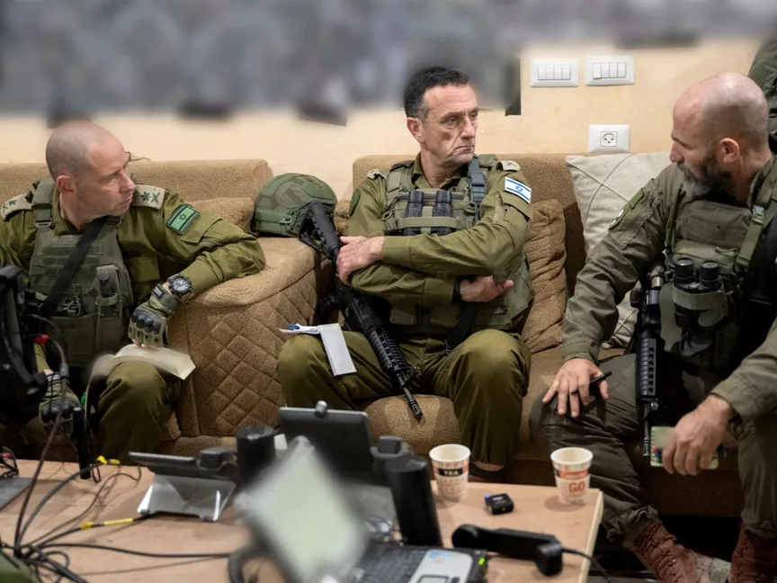 قائد الفرقة 98 دان جولدفوس (على اليمين) وإلى جانبه رئيس أركان الجيش الإسرائيلي هرتسي هاليفي  أثناء تقييم الوضع في خان يونس جنوب قطاع غزة. 23 ديسمبر 2023 - AFP