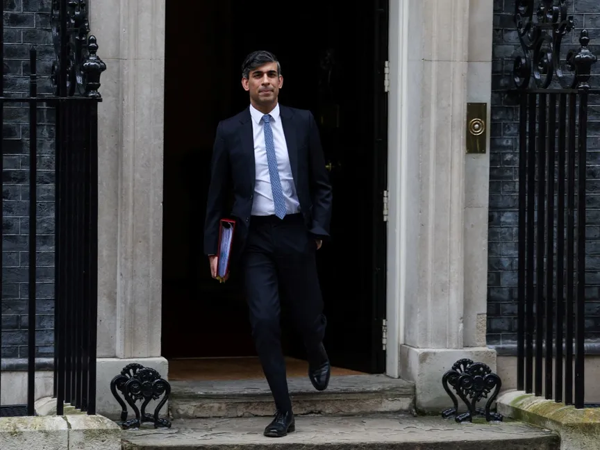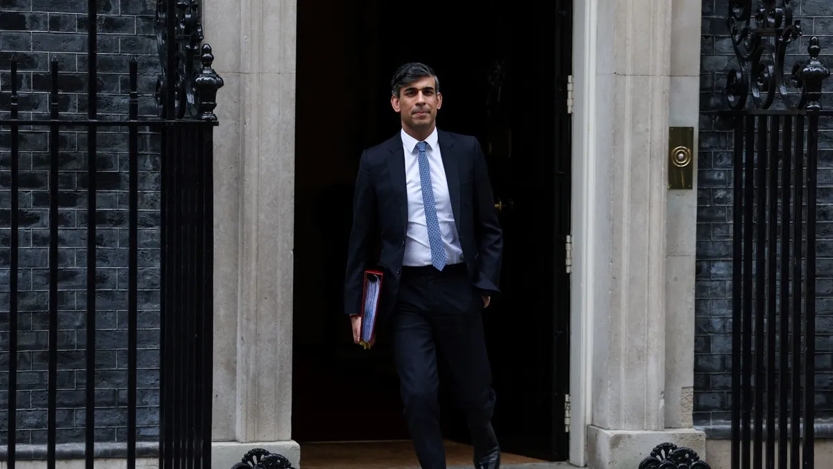 رئيس الوزراء البريطاني ريشي سوناك يغادر "10 داونينج ستريت" في العاصمة البريطانية لندن. 13 مارس 2024 - AFP