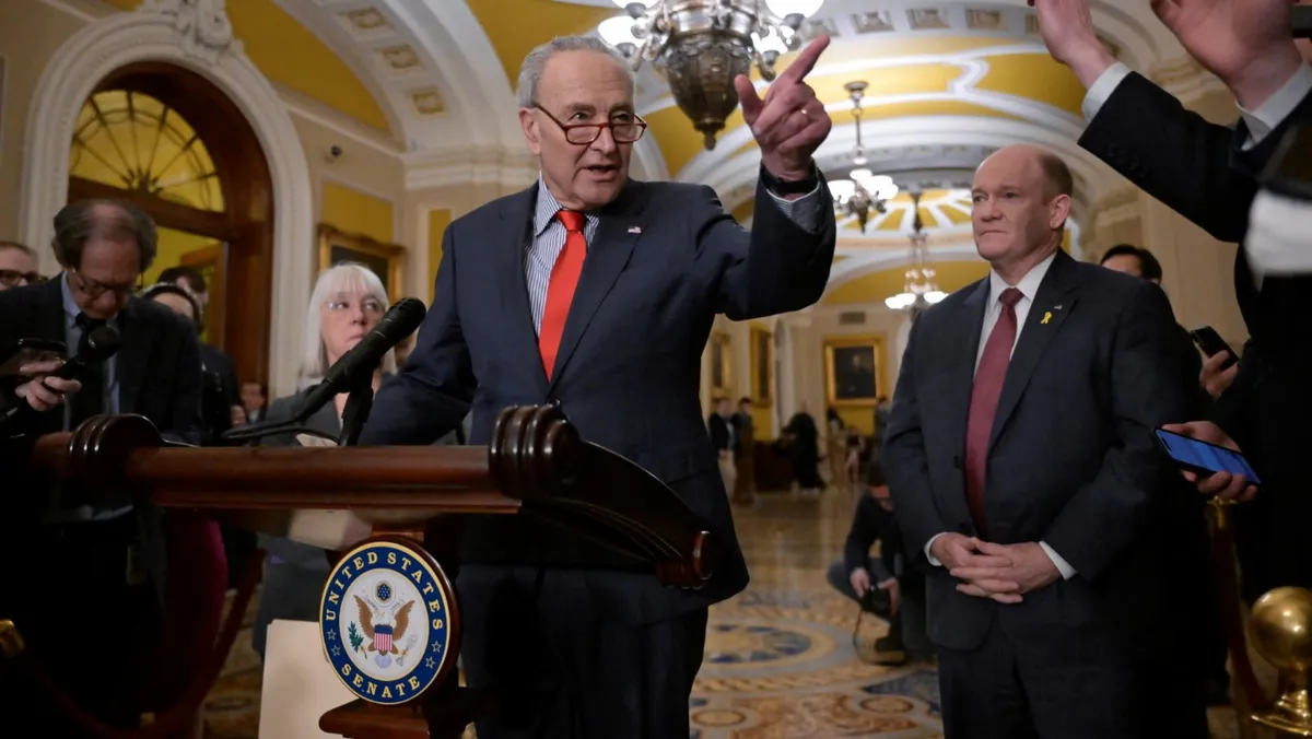 زعيم الأغلبية في مجلس الشيوخ الأميركي تشاك شومر خلال مؤتمر صحافي في مبنى الكابيتول بواشنطن. 14 مارس 2024 - Reuters