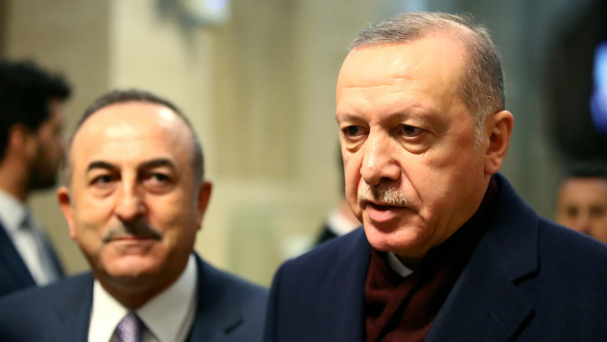 الرئيس التركي رجب طيب أردوغان يتحدث إلى وسائل الإعلام بجانب وزير خارجيته مولود جاويش أوغلو في مدينة جنيف السويسرية، 17 ديسمبر 2019 - REUTERS