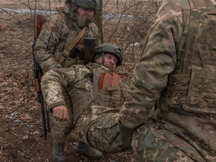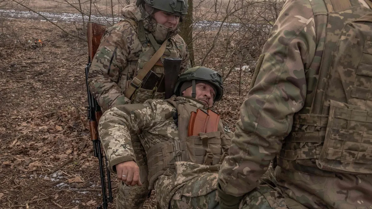 جنود أوكرانيون يجلون جندياً مصاباً في منطقة دونيتسك شرقي أوكرانيا. 31 يناير 2024 - AFP
