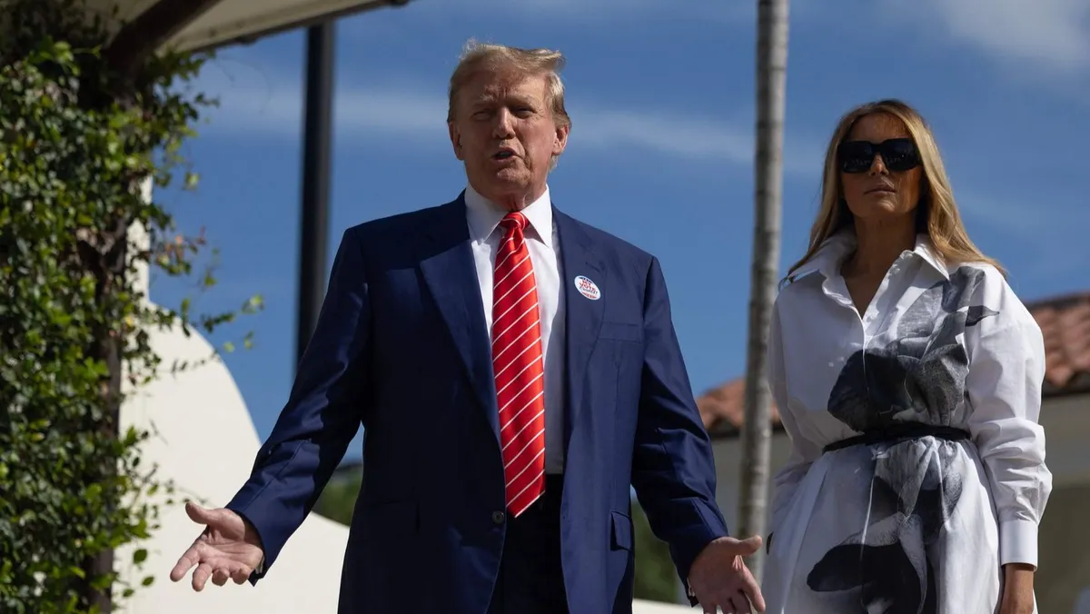الرئيس الأميركي السابق دونالد ترمب والسيدة الأولى السابقة ميلانيا ترمب يتحدثان إلى وسائل الإعلام في فلوريدا. 19 مارس 2024 - Getty Images via AFP