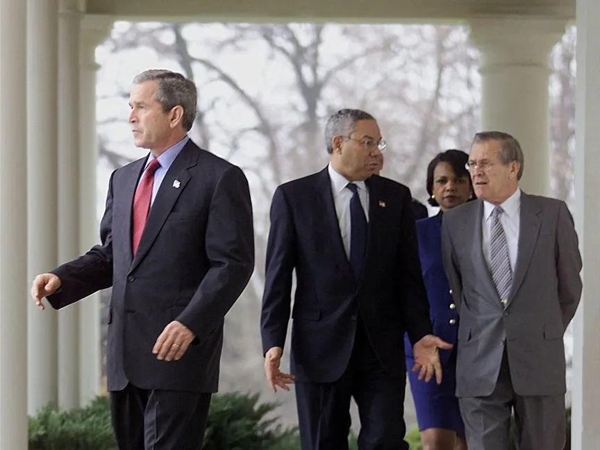 وقال بوش للرئيس الحريري إنه عاقد العزم على التخلص من صدام، "ولكن لا أعرف كيف بعد. ولكننا سنفعل ذلك. كنت أتمنى أن لا أتكلف مالا للقيام بذلك". وقبل أن يتحدث عن كوريا الشمالية والشرق الأوسط، أضاف: "إننا ندرك أننا جميعا مسؤولون، جميع الحكومات تتحمل المسؤولية في وضع أسس السلام وفي دعوة الناس لتحمل مسؤولياتهم". وأردف قائلا إنه يريد من الدول العربية تحمل مسؤولياتها في هذا المجال.