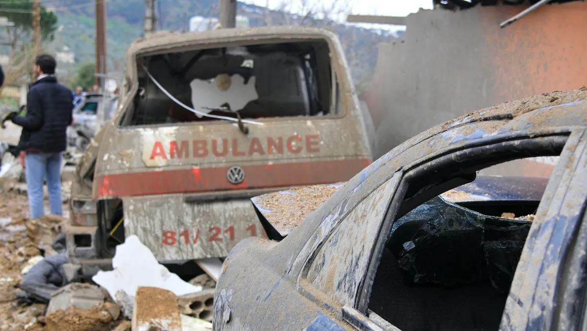 حطام سيارة إسعاف في موقع مركز الإسعاف الذي قصفته إسرائيل في الهبارية بجنوب لبنان. 27 مارس 2024 - AFP