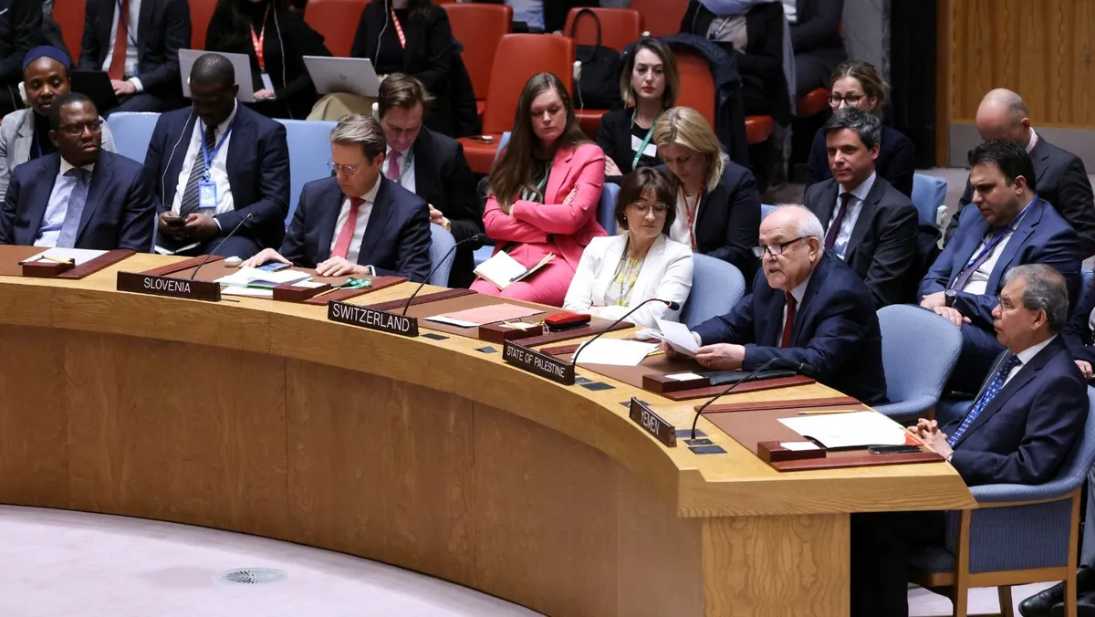 سفير فلسطين لدى الأمم المتحدة رياض منصور يخاطب مجلس الأمن بمقر الأمم المتحدة في نيويورك بالولايات المتحدة خلال جلسة التصويت على قرار يطالب بوقف فوري لإطلاق النار في غزة. 25 مارس 2024 - Reuters