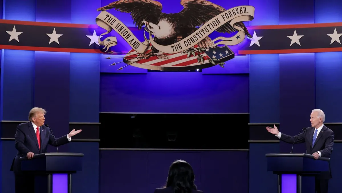 الرئيس الأميركي السابق دونالد ترمب ومنافسه الديمقراطي في انتخابات الرئاسة الرئيس الحالي جو بايدن في مناظرة بجامعة بلمونت بولاية تينيسي. أكتوبر 2020 - REUTERS