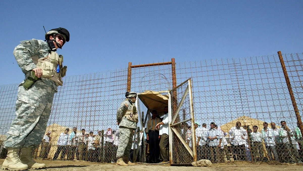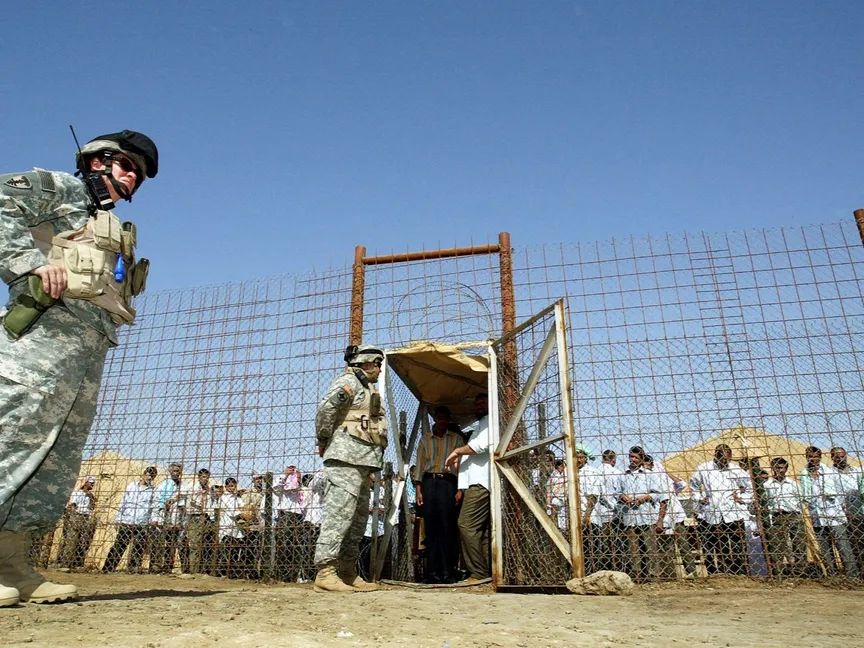 جنود أميركيون يشرفون على إطلاق سراح سجناء من سجن أبو غريب في العراق. 23 يونيو 2006 - AFP