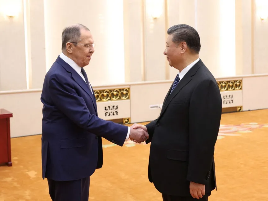 الرئيس الصيني شي جين بينج يستقبل وزير الخارجية الروسي سيرجي لافروف في قاعة الشعب الكبرى في بكين. 9 أبريل 2024 - Reuters