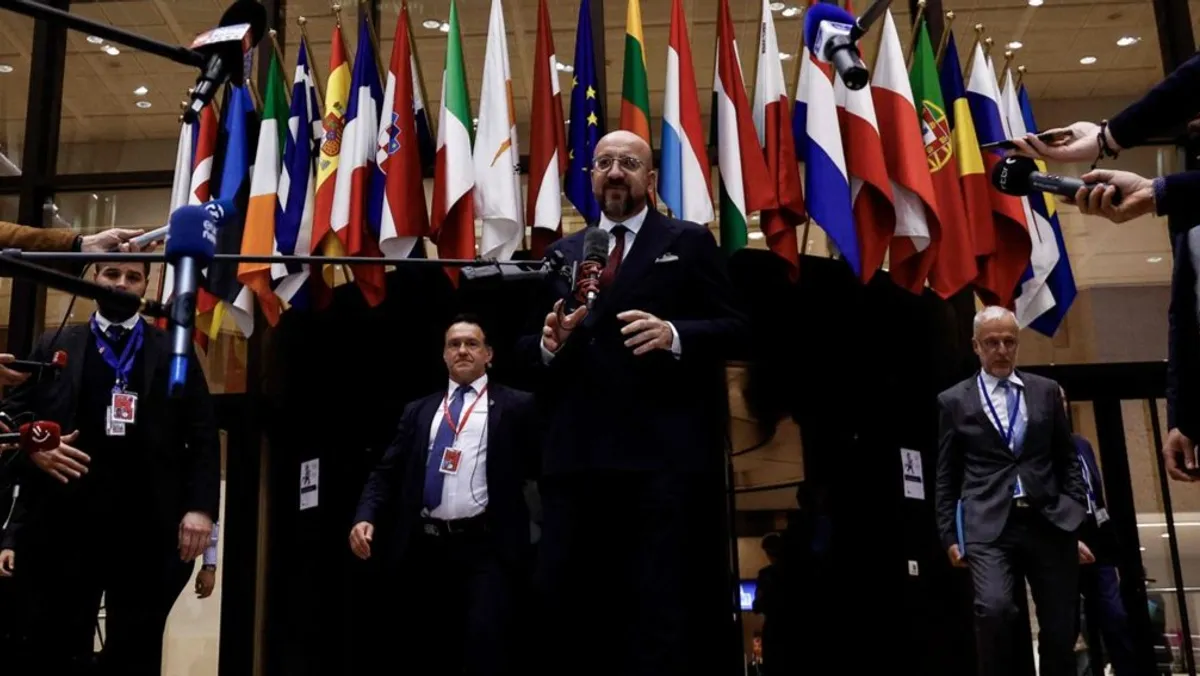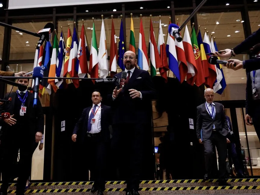 رئيس المجلس الأوروبي شارل ميشيل يتحدث إلى الصحافيين في نهاية اليوم الأول لقمة الاتحاد الأوروبي في بروكسل. 18 أبريل 2024 - AFP