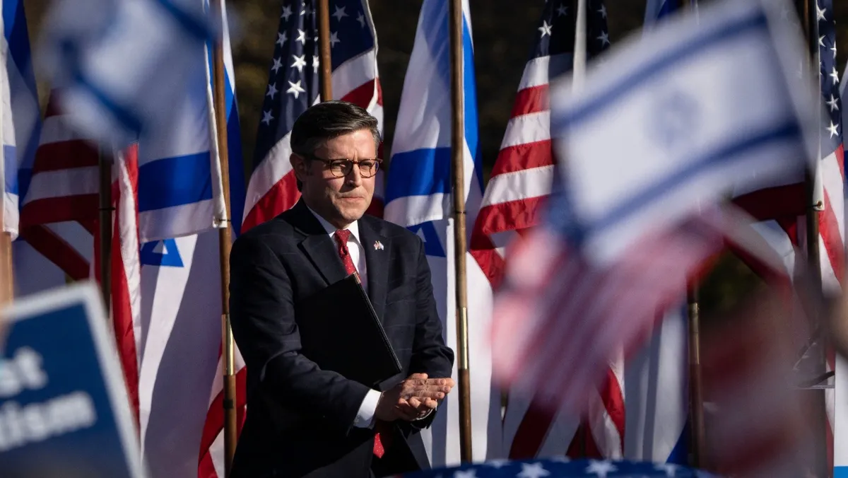 رئيس مجلس النواب الأميركي مايك جونسون خلال تجمع في واشنطن لدعم إسرائيل في حربها على غزة. 14 نوفمبر 2023 - Reuters