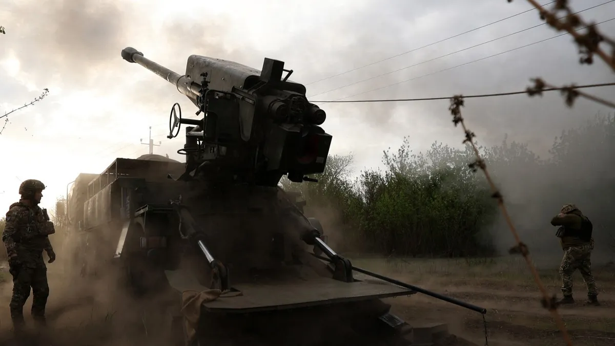 جنود من فرقة المدفعية التابعة للجيش الأوكراني تطلق قذائف من عيار 155 ملم على المواقع الروسية في منطقة خاركوف. 21 أبريل 2024 - AFP