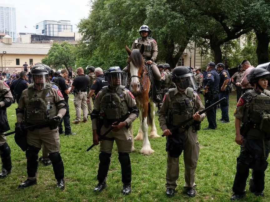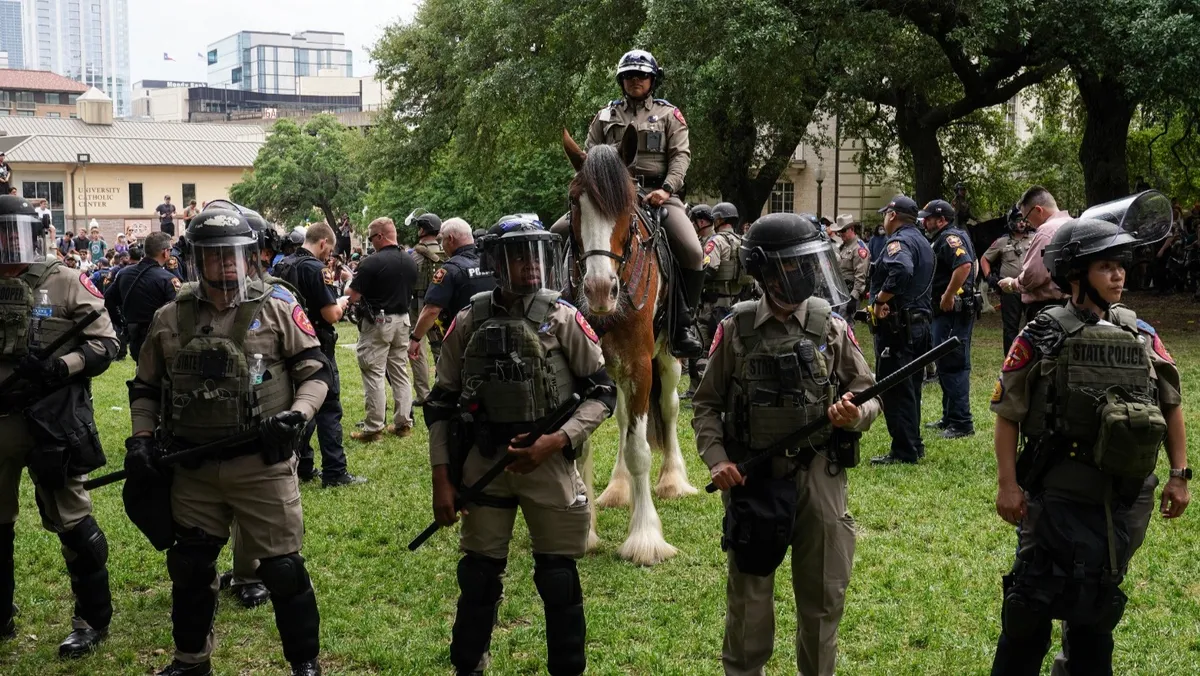 وعلى بعد آلاف الأميال، قام عناصر الأمن الذين يمتطون جياداً بتوقيف طلاب في جامعة تكساس الواقعة في مدينة أوستن.