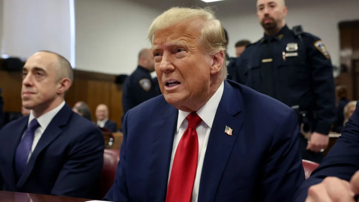 الرئيس الأميركي السابق دونالد ترمب مع محاميه في محكمة مانهاتن الجنائية في نيويورك. 25 أبريل 2024 - Bloomberg