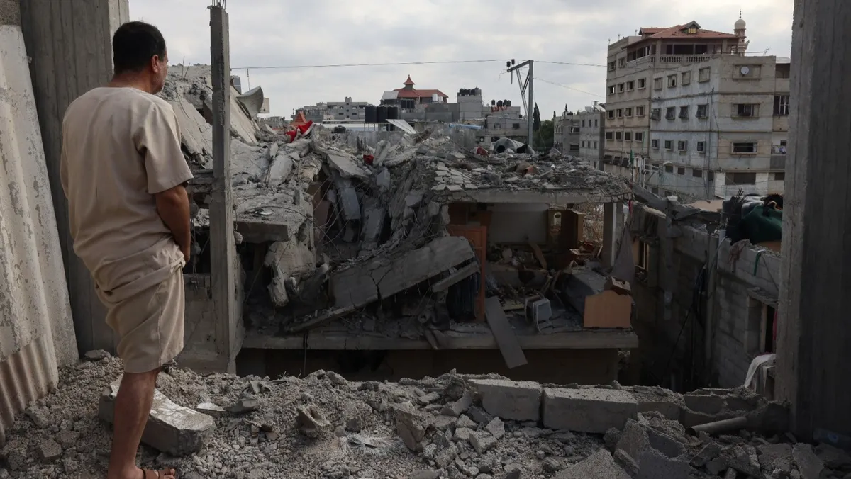 فلسطيني ينظر للمباني المدمرة بسبب الغارات والقصف الإسرائيلي المتواصل على رفح جنوب قطاع غزة. 29 أبريل 2024. غزة، فلسطين - AFP