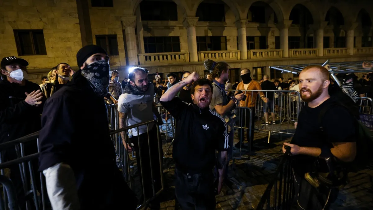 واندلعت الاحتجاجات وأعمال العنف، بعد يوم من هجوم الملياردير مؤسس حزب "الحلم الجورجي"، بيدزينا إيفانيشفيلي، على الغرب وزعم أن القوى الأجنبية التي وصفها بأنها "حزب حرب عالمي" تحاول الإطاحة بالحكومة من خلال الاستعانة بالمنظمات غير الحكومية.