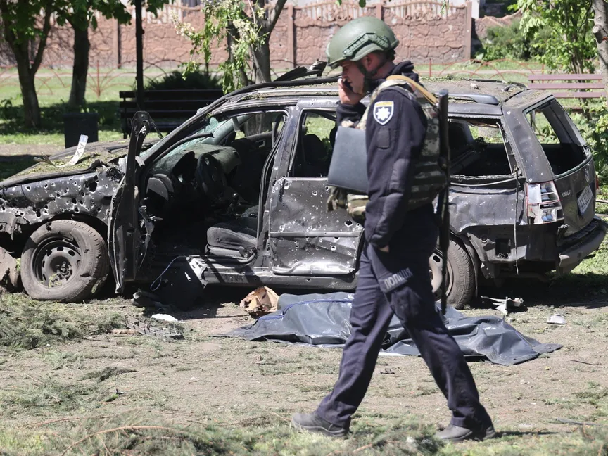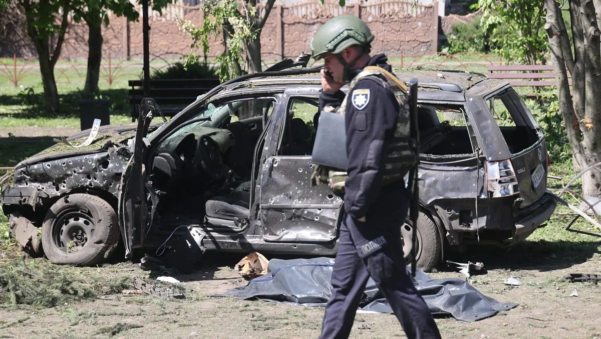 شرطي أوكراني يمر بجانب جثة ملقاة بالقرب من سيارة محترقة جراء استهدافها بقصف روسي في خاركوف. 1 مايو 2024 - AFP