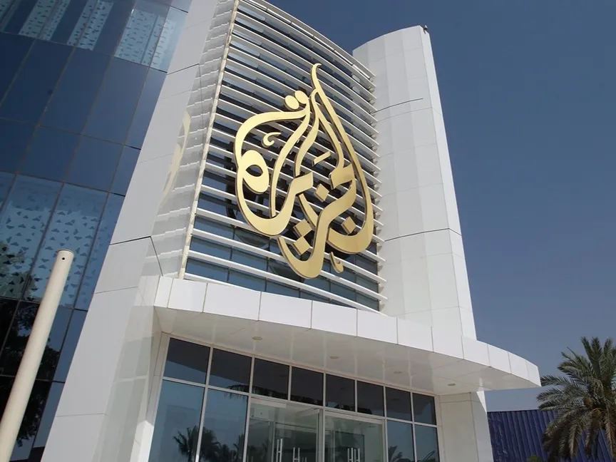 شعار قناة الجزيرة التلفزيونية القطرية على مقرها في الدوحة - aljazeera.net
