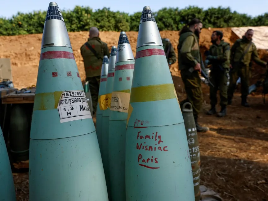 جنود إسرائيليون قرب قذائف مدفعية خلال الحرب التي تشنها إسرائيل على غزة. 15 نوفمبر 2023 - Reuters