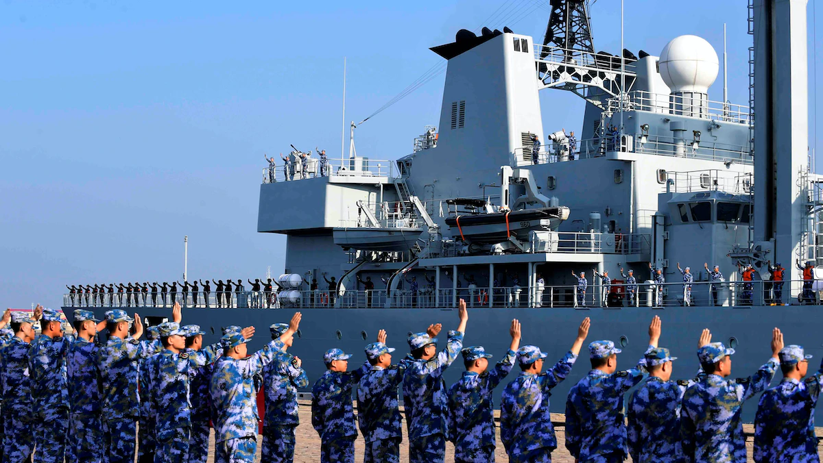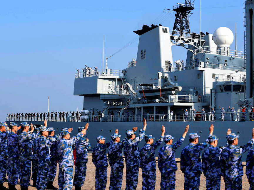جنود من البحرية الصينية يودّعون سفينة حربية خلال مهمة إلى خليج عدن - مقاطعة شاندونغ - الصين - 3 سبتمبر 2020 - REUTERS