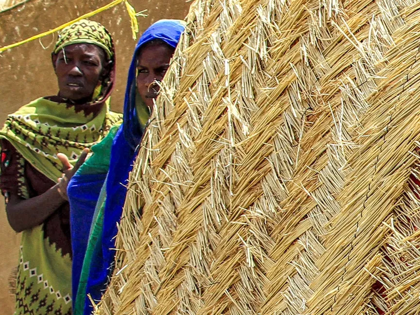 نساء يقفن خلف خيمة مغطاة بأغطية من القش في مخيم للنازحين بسبب الصراع في ولاية القضارف شرق السودان. 15 مايو 2024 - AFP