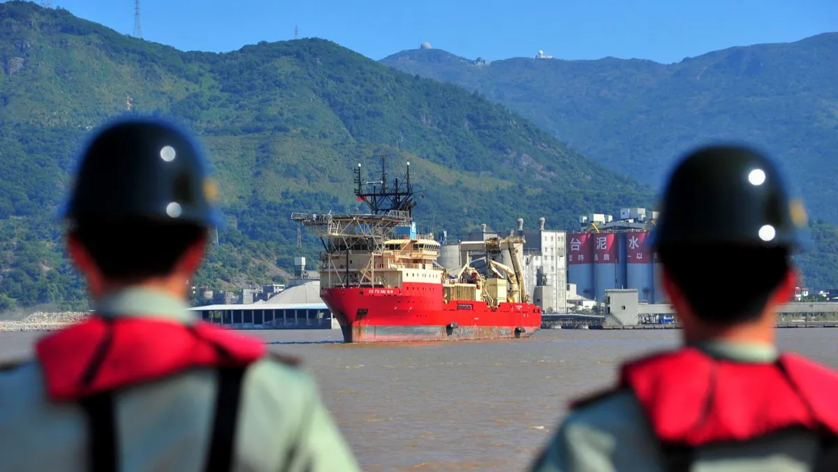 سفينة إصلاح الكابلات Fu Hai تصل إلى ميناء ماوي في فوتشو بمقاطعة فوجيان جنوب غربي الصين. 18 أكتوبر 2012 - AFP