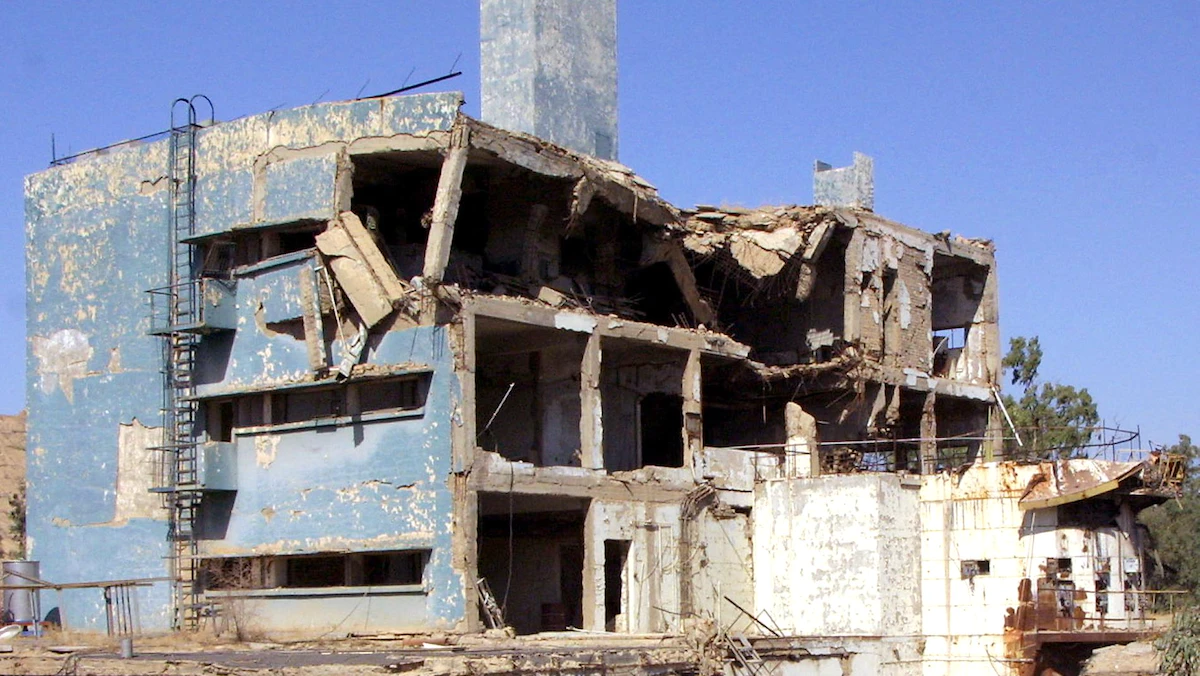 مبانٍ مدمرة يعتقد أنها تستخدم لتخزين المواد المشعة النشطة في المفاعل النووي العراقي الذي قصفته إسرائيل عام 1981 ثم ضرب في وقت لاحق عام 1991 - AFP