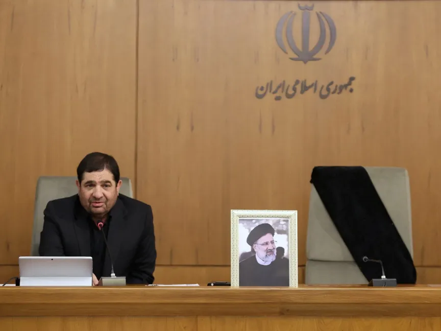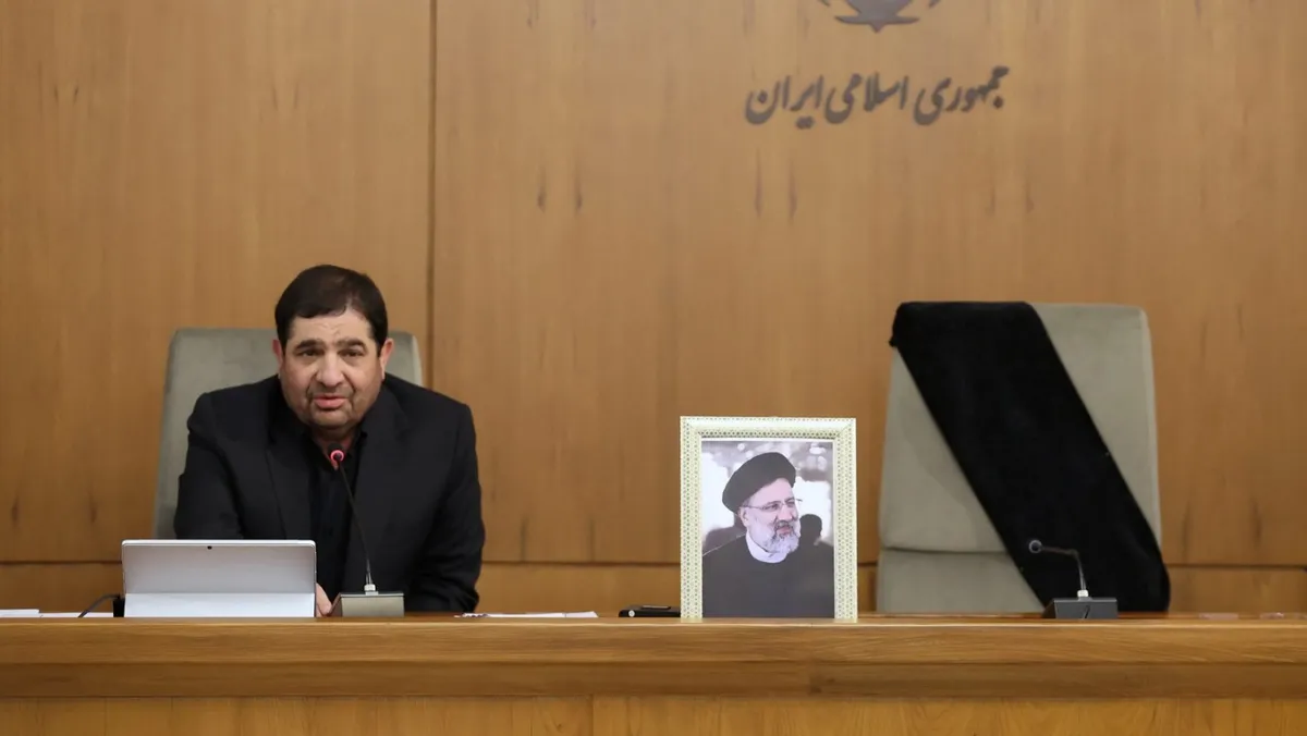 النائب الأول للرئيس الإيراني محمد مخبر الذي تم تكليفه بمهام الرئاسة ومقعد الرئيس الراحل إبراهيم رئيسي في طهران. 20 مايو 2024 - AFP