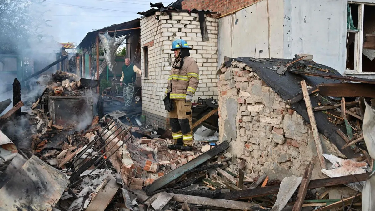 رجال الإطفاء يزيلون الأنقاض من المنازل في ضواحي خاركيف الأوكرانية التي دمرها هجوم الطائرات الروسية المسيرة، 21 مايو 2024 - AFP
