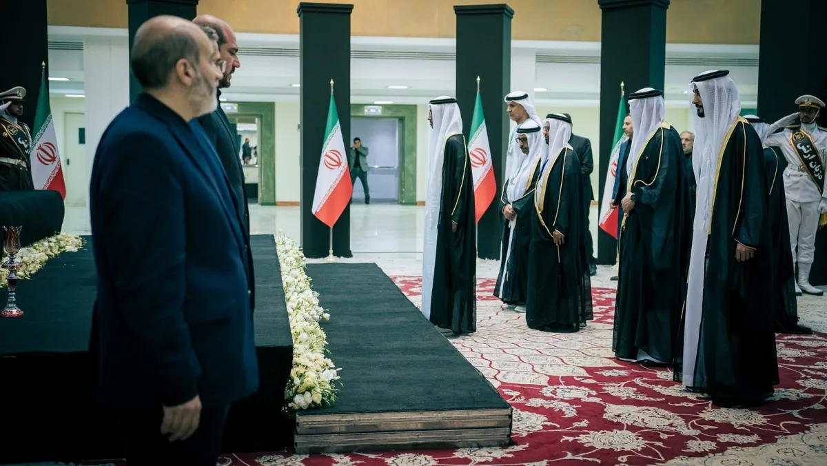 وفد دولة الإمارات خلال مشاركته في مراسم العزاء الرسمية للرئيس الإيراني الراحل إبراهيم رئيسي في طهران. 22 مايو 2024 - @OFMUAE