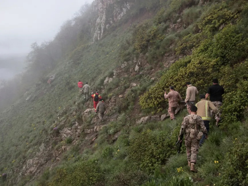 فرق الإنقاذ بالقرب من حطام المروحية التي كانت تقل الرئيس الإيراني إبراهيم رئيسي في محافظة أذربيجان الشرقية. 20 مايو 2024 - REUTERS