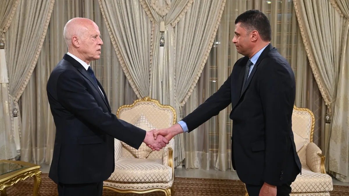 الرئيس التونسي قيس سعيد يصافح وزير الداخلية الجديد خالد النوري، تونس. 25 مايو 2024 - الرئاسة التونسية