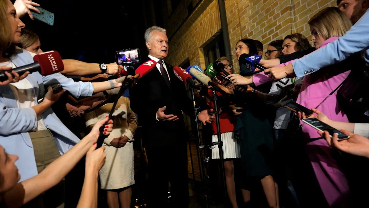 الرئيس الليتواني جيتاناس ناوسيدا يتحدث إلى وسائل الإعلام بينما يحتفل بالفوز في الجولة الأخيرة من الانتخابات الرئاسية في فيلنيوس، ليتوانيا. 26 مايو 2024 - Reuters