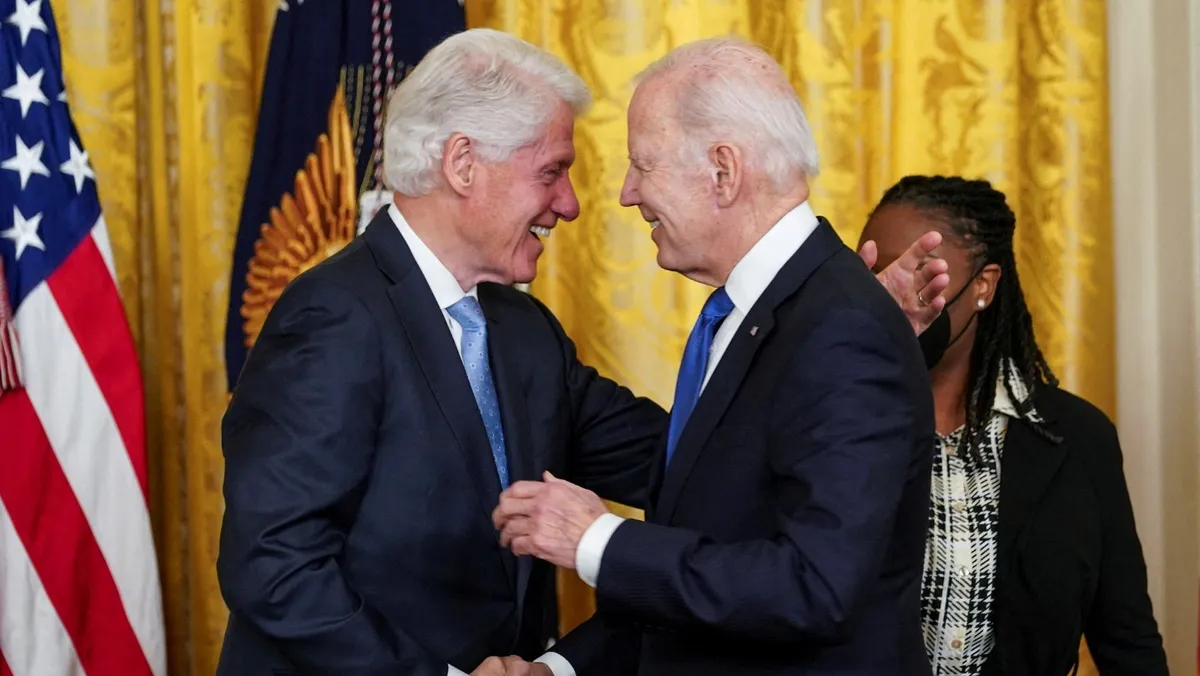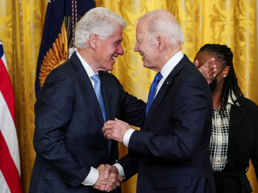 الرئيس الأميركي السابق بيل كلينتون يصافح الرئيس الحالي جو بايدن خلال حفل سابق بالبيت الأبيض في واشنطن. 2 فبراير 2023 - REUTERS