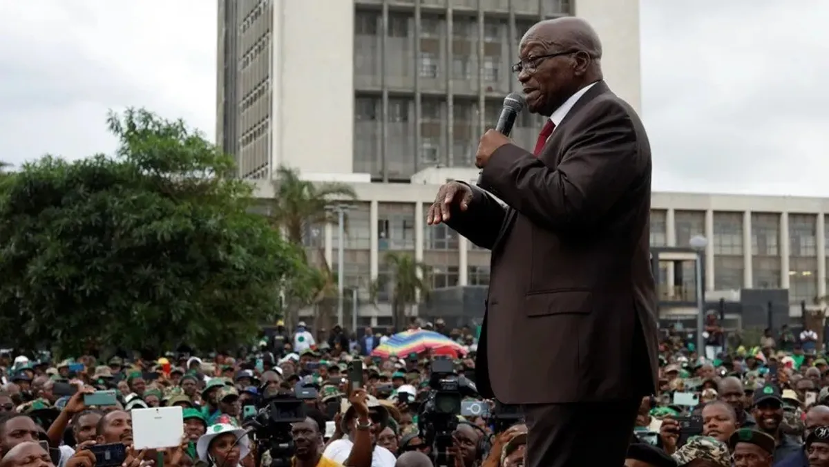 رئيس جنوب إفريقيا السابق جاكوب زوما يتحدث أمام أنصاره خارج المحكمة العليا في مدينة ديربان. 27 مارس 2024 - Reuters